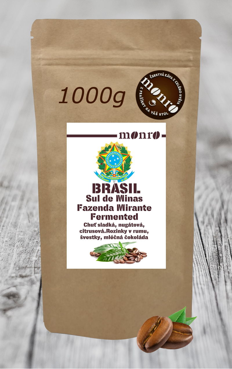 Hotová kávaBrasil Fazenda Sul de Minas Mirante SS FC Fermented má sladké a hladké plné, krémové, hedvábné tělo s podtóny rozinky máčené v rumu, sušené švestky, mléčné čokolády a sladkých citrusů. Vůně ovoce, likéru a čokolády.