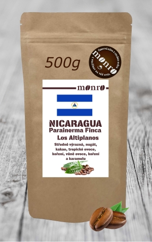 Čerstvě pražená nikaragujská 100% výběrová Arabika Parainerma Finca Los Altiplanos se řadé mezi Arabiky Excelent s hodnocením 85,25 SCA. Hotová káva je vyvážená,má hladké, hedvábné tělo, středně výrazné s chutí vyváženou sladkostí nugátu, karamelu, červených hroznů, citrusů, s tóny limetky, zeleného jablka, bezového květu a nádechem bylin. Káva má nádhernou ovocno nugátovou vůni. Chuťový profil je idálně vyvážený.
