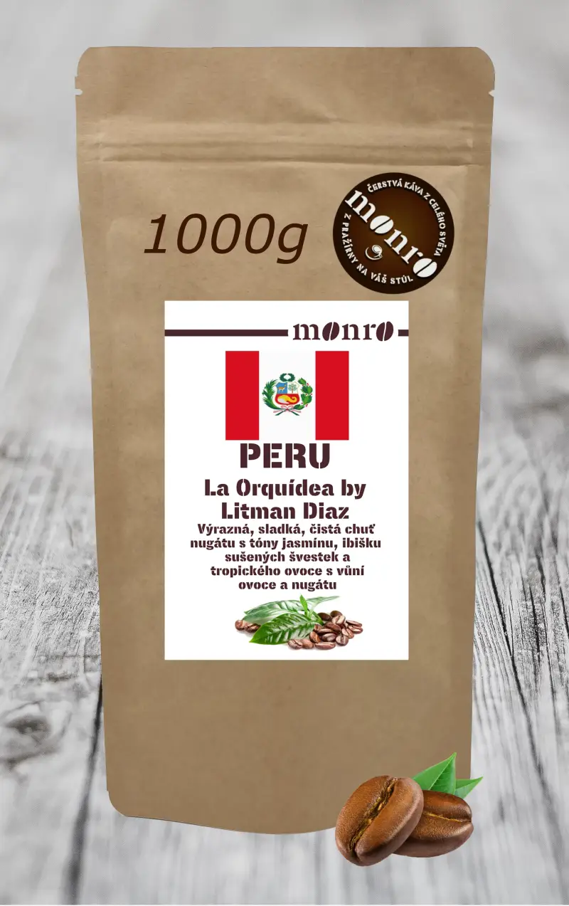 Čerstvě pražená káva 100% výběrováArabika Peru La Orquídea by Litman Diaz Campos Organicje jednou z nejlepších a nejkvalitnějších peruánských káv s hodnocením Excelent Arabika 88SCA.